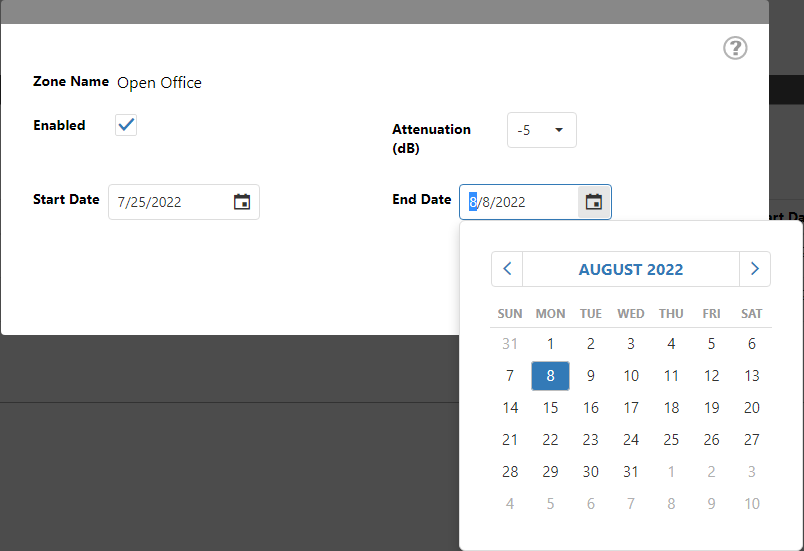 2. Attenuation may be set to the desired final volume for the zone along with the duration of the soft start timeframe. Start and end dates of the soft start and attenuation are set according to the preference of the sound-masking architect.