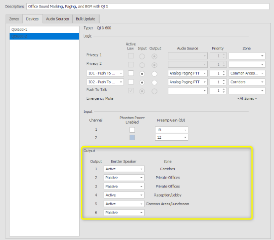 All emitters in the configuration file are set to match the zone sources. Open office masking and private offices are assigned as passive, while other areas that require paging and background sources are set to active to match emitter requirements. This setting is located in the devices tab under output.