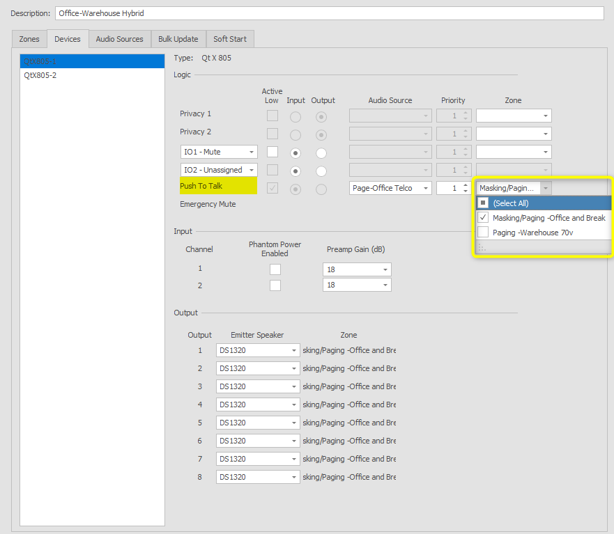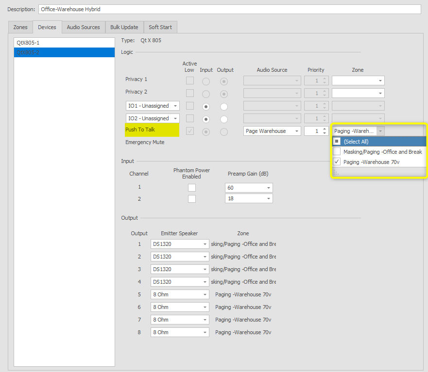 Analog audio sources have been added and assigned to devices to support the telephone and desk paging requirements. This application will be configured using logic inputs to trigger paging to zones.